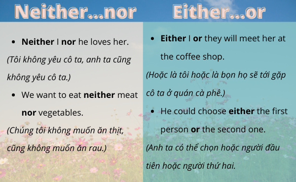 “Either” : có nghĩa là hoặc là cái này hoặc là cái kia; “Either” thường được sử dụng kết hợp với động từ ở dạng số ít khẳng định nhưng chủ yếu là dùng trong câu hỏi và câu phủ định