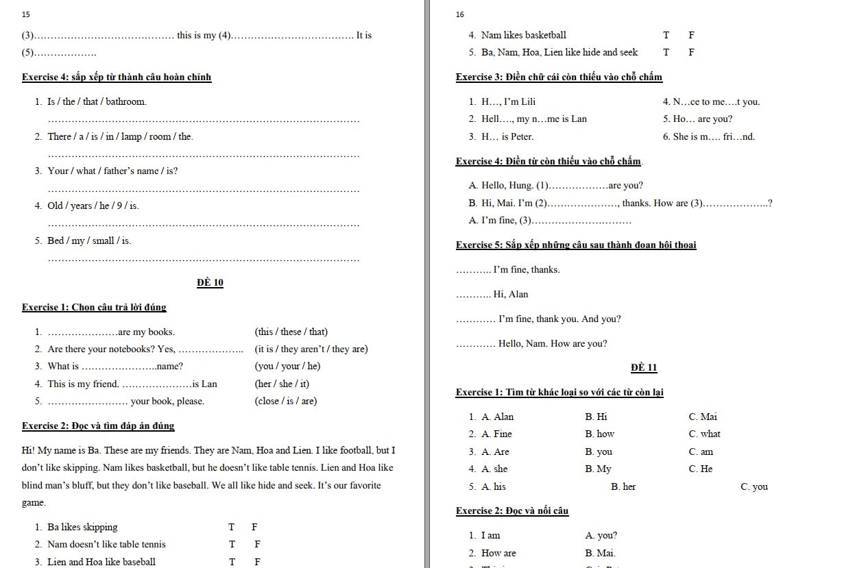 Hi! My name is Ba. These are my friends. They are Nam, Hoa and Lien. I like football, but I don’t like skipping. Nam likes basketball, but he doesn’t like table tennis. Lien and Hoa like blind man’s bluff, but they don’t like baseball. We all like hide and seek. It’s our favorite game.