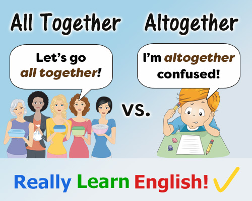 Bạn từng bắt gặp All together và Altogether, vậy bạn có biết altogether là gì? Và phân biệt chúng như nào? Altogether và altogether đều là trạng từ. Trong một số trường hợp, all together cũng được dùng như một tính từ, trong khi đó altogether là một liên trạng từ.