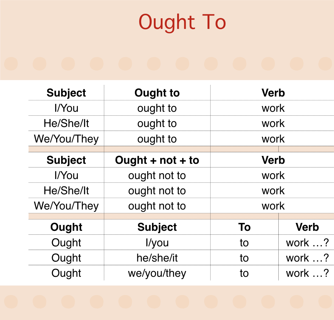- “Ought to” chỉ có thì hiện tại, không biến đổi khi chia bất kì dạng thức nào và nó có thể thay thế “Should” trong một vài trường hợp.