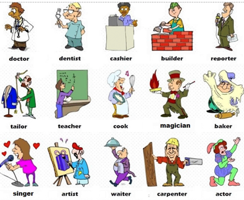 - Nghề nghiệp: doctor (bác sĩ), cashier (thu ngân), reporter (phóng viên), journalist (nhà báo), teacher (giáo viên), artist (nghệ sĩ), secretary (thư kí), programmer/developer (lập trình viên), photographer (nhiếp ảnh gia), receptionist (lễ tân), v.v