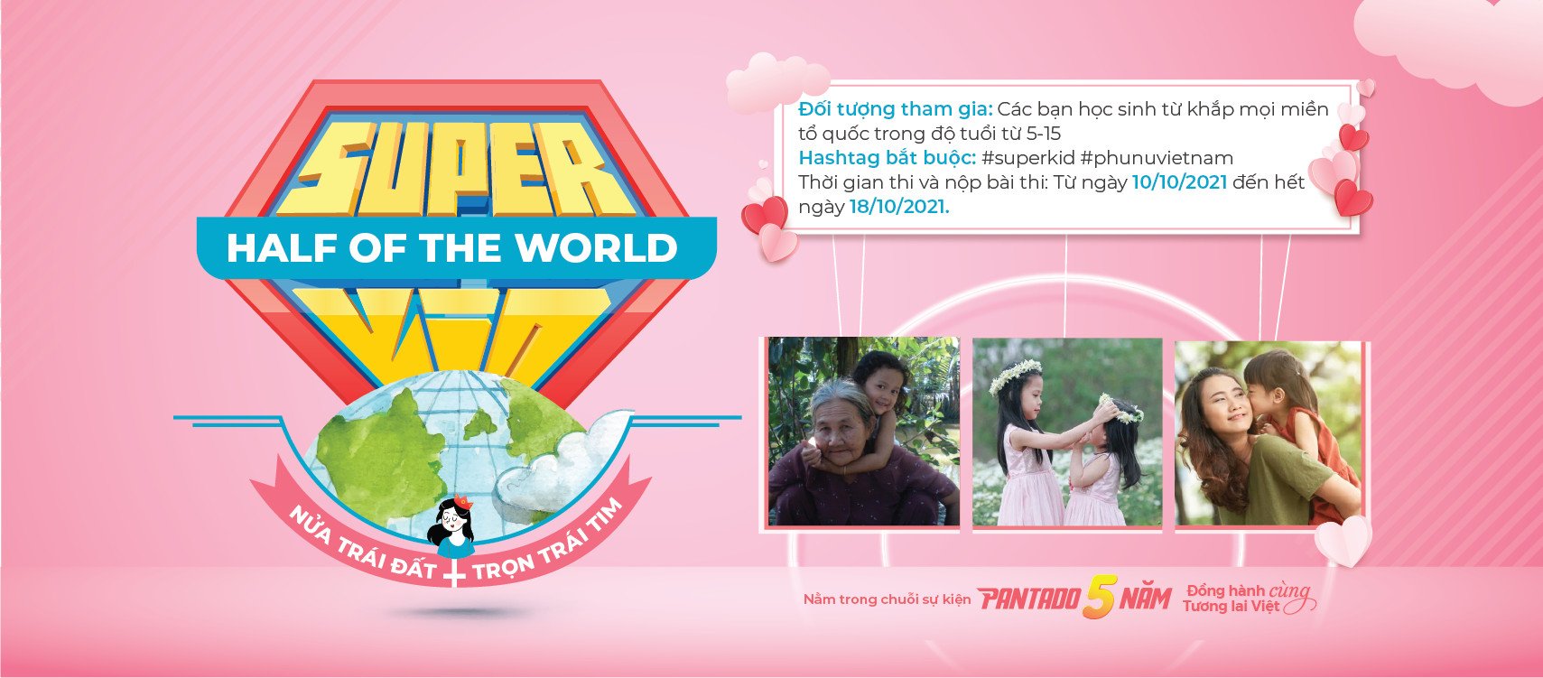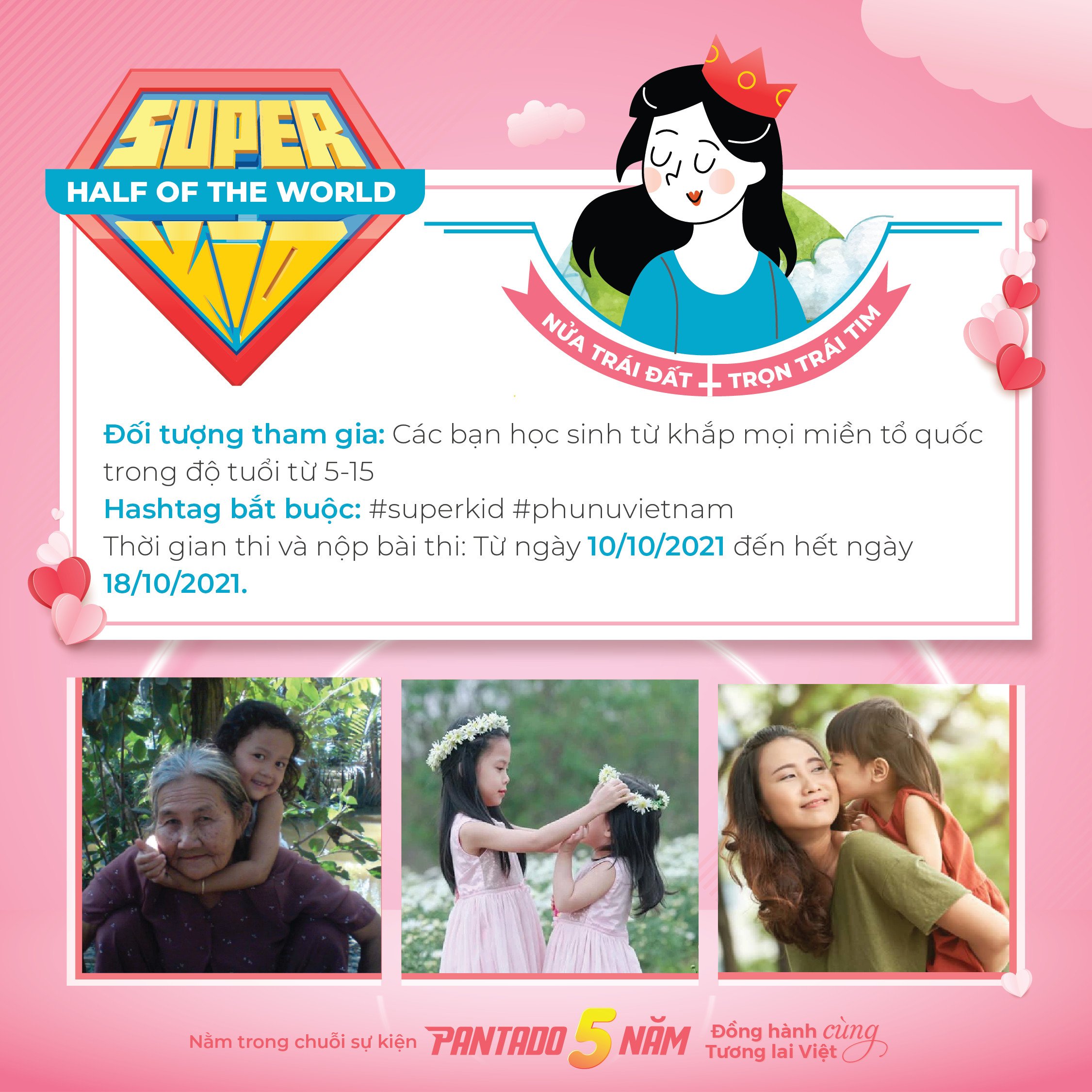 Và đặc biệt, sắp đến 20/10 – ngày Phụ nữ Việt Nam, đây cũng chính là dịp để các con bày tỏ tình niềm yêu thương, tình cảm sâu sắc nhất dành cho họ. Chính bởi vậy, nhân ngày Phụ nữ Việt Nam, Pantado hân hạnh tổ chức chương trình tri ân thông qua cuộc thi: “Superkid – Half Of The World”. Hy vọng trong mùa thi Superkid lần này BTC sẽ nhận được những bài dự thi đầy cảm xúc và sáng tạo của các con như mùa thi Superkid vừa qua.