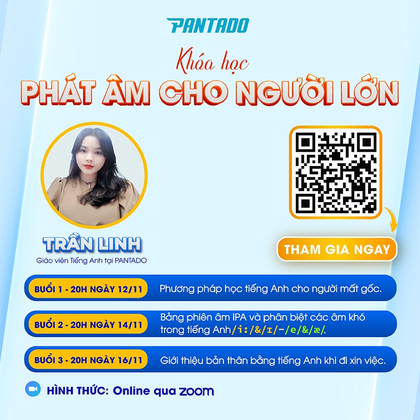 Khóa học “PHÁT ÂM TIẾNG ANH CHO NGƯỜI LỚN” từ PANSHARING áp dụng các phương pháp thực tế, dễ hiểu giúp bạn xóa bỏ rào cản ngôn ngữ, mở rộng cơ hội phát triển bản thân. Đây không chỉ là khóa học phát âm mà còn là bước đệm để bạn tiến xa hơn trên con đường học tập và phát triển sự nghiệp.