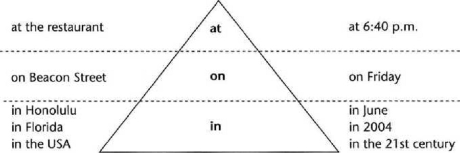 Ba giới từ gây ra nhiều rắc rối là at, on , and in . Ba giới từ này có nhiều cách sử dụng khác nhau, nhưng có một cách dễ dàng để nhớ một số giới từ trong số chúng. Nghiên cứu sơ đồ và các biểu đồ dưới đây.