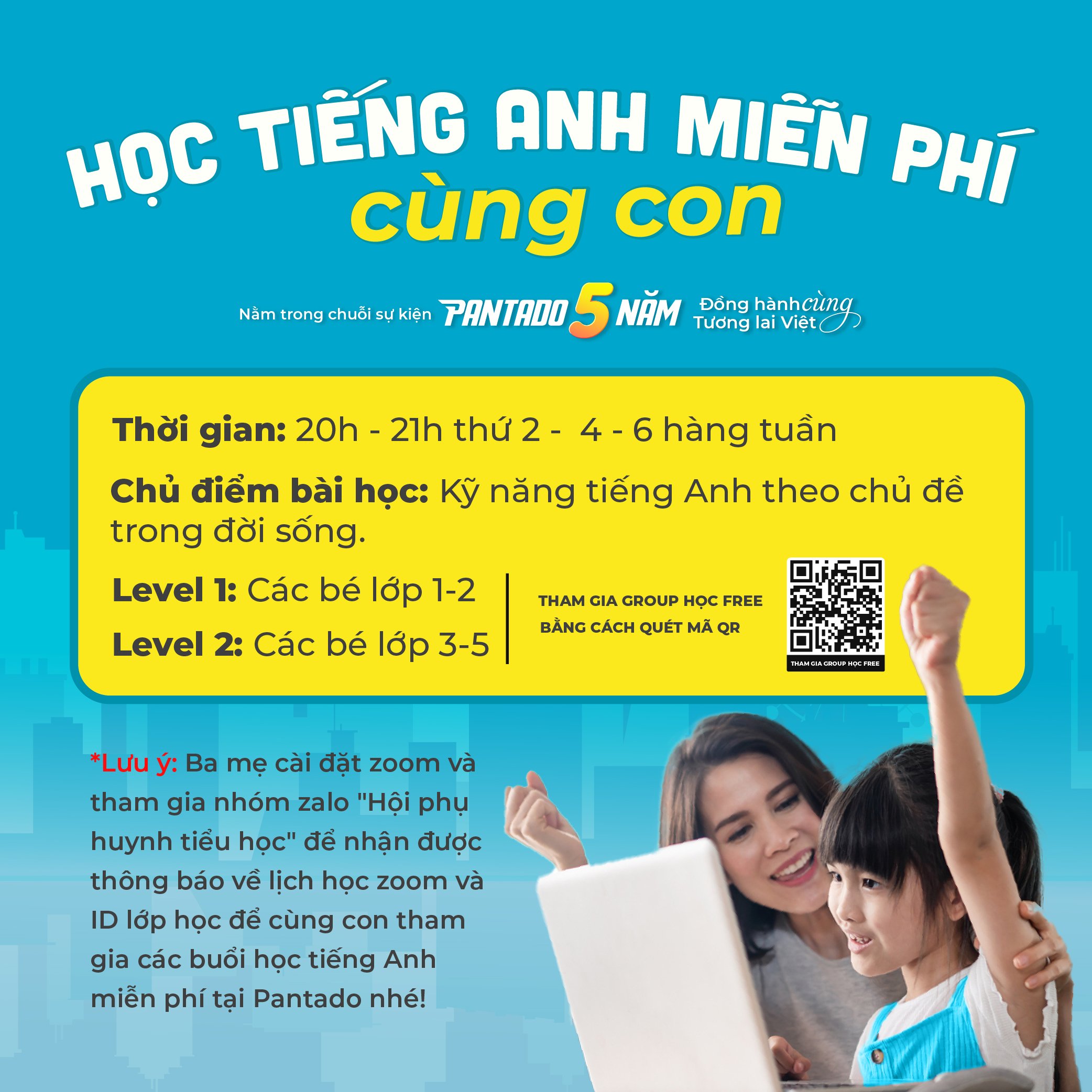 Tiếng Anh ngày càng trở nên quan trọng trong cuộc sống cũng như trong học tập. Tuy nhiên với tình hình dịch Covid 19 diễn biến vô cùng phức tạp khiến cho các bé không thể đến trường. Hiểu được mong muốn của phụ huynh và các em học sinh, trung tâm Anh ngữ Pantado tổ chức các lớp học tiếng Anh online MIỄN PHÍ nằm trong chuỗi sự kiện “Pantado – 5 năm đồng hành cùng tương lai Việt”, giúp các con có thời gian ôn luyện hằng ngày. Hình thức này sẽ giúp ích hơn các con rất nhiều vì các con sẽ được học bài bản và có người đồng hành thay vì mong chờ vào sự tự giác của con.