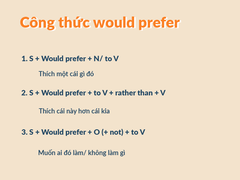 Lưu ý: Cấu trúc Would prefer thường được sử dụng trong bối cảnh yêu cầu sự lịch sự, trang trọng nhiều hơn là trong bối cảnh giao tiếp thường ngày.