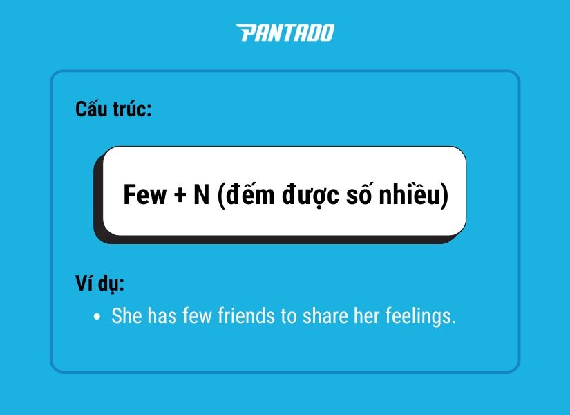 “Few” cũng đi với danh từ đếm được số nhiều, nhưng mang nghĩa rất ít, gần như không có đủ, mang sắc thái tiêu cực.