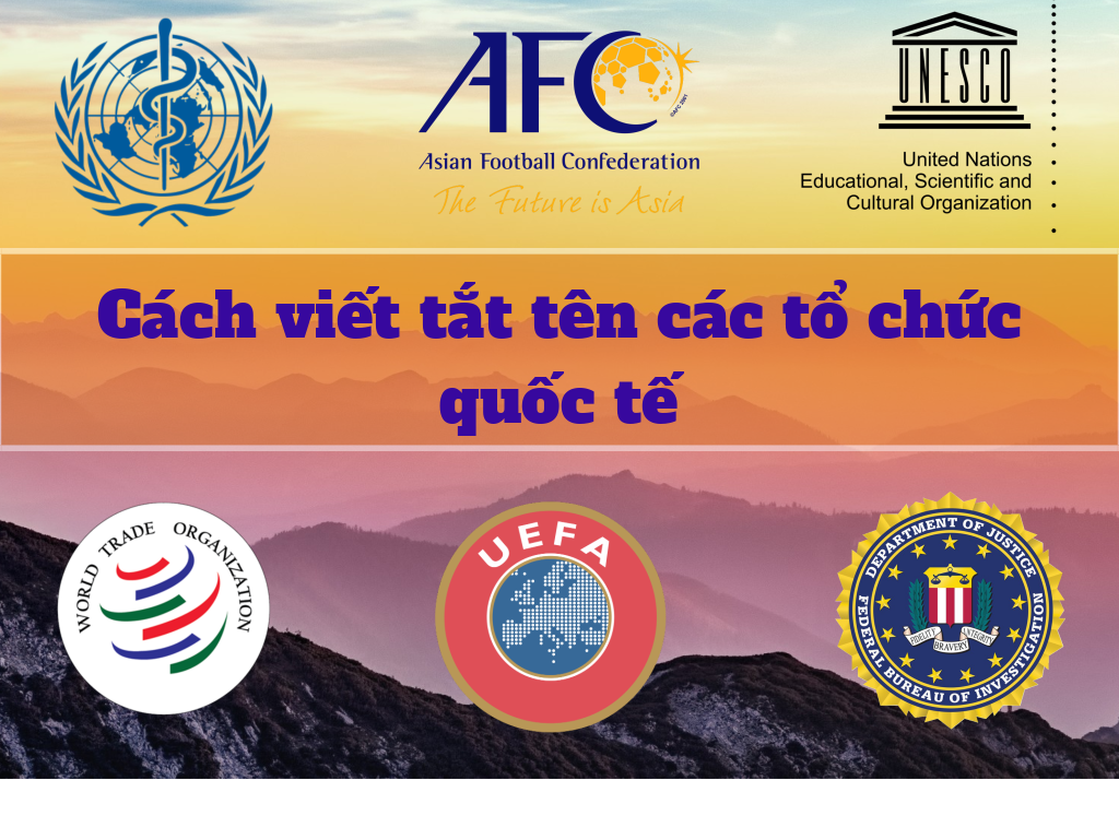 Có rất nhiều tên tổ chức Quốc tế lớn và nổi tiếng trên thế giới bằng tiếng Anh được viết tắt. Điều này gây khó khăn cho chúng ta khi theo dõi các tin tức trên TV, báo chí. Đôi khi có thể chúng ta biết đó là hiệp hội gì, hay tổ chức gì nhưng lại không biết chính xác tên đầy đủ bằng tiếng Anh của những tổ chức đó. Dưới đây là tổng hợp các tên viết tắt – tên đầy đủ – tên tiếng Việt của các tổ chức. Mời các bạn tìm hiểu: