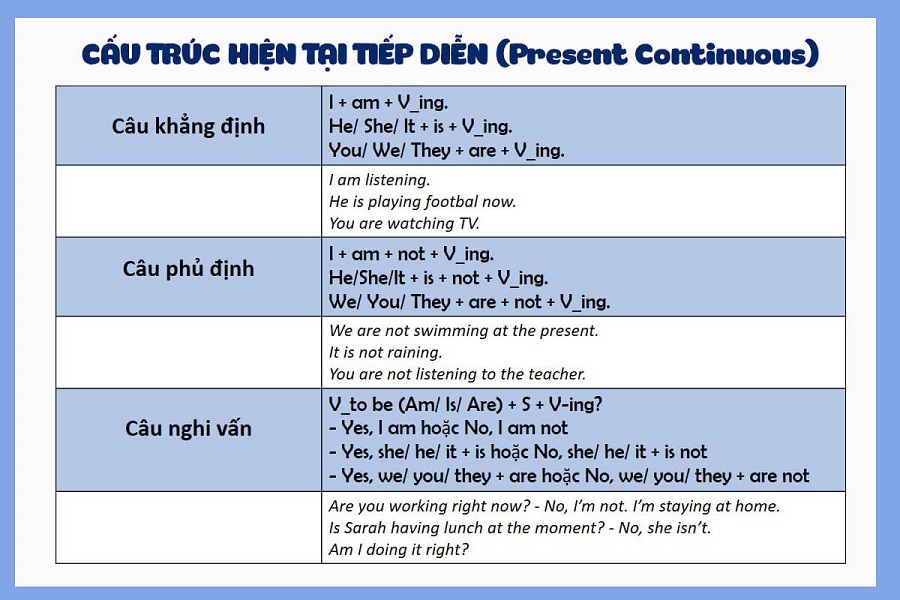 Thì hiện tại tiếp diễn : dùng để diễn tả một sự việc, hành động, đang xảy ra vào thời điểm hiện tại, và kéo dài ở một thời điểm trong tương lai gần. Hãy cùng chúng tôi tìm hiểu kỹ hơn về dạng thì hiện tại tiếp diễn nhé: