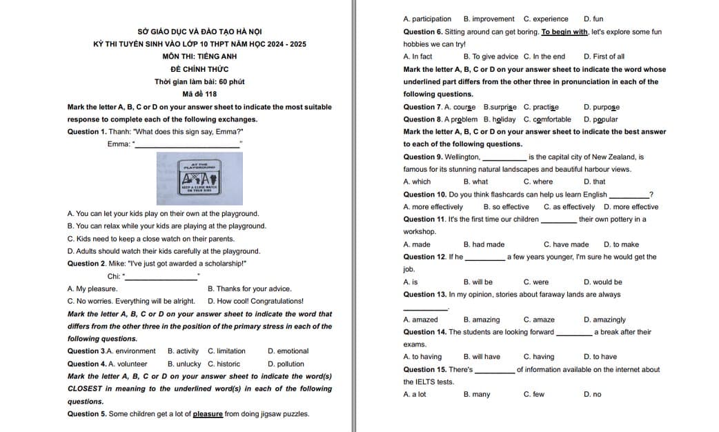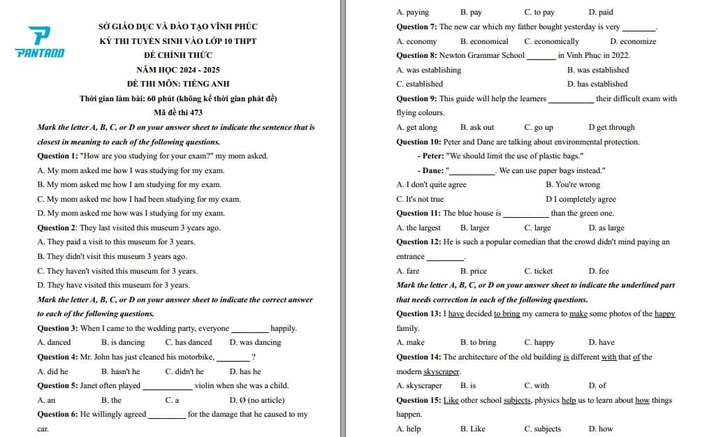 Đề thi chính thức môn Tiếng Anh tuyển sinh vào lớp 10 tỉnh Vĩnh Phúc năm 2024 – 2025. Xem chi tiết đề thi trong bài viết này.