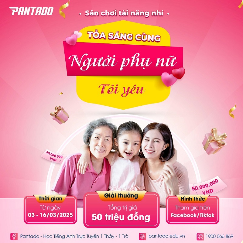 Pantado mang đến sân chơi tài năng nhí "TỎA SÁNG CÙNG NGƯỜI PHỤ NỮ TÔI YÊU" – nơi bé có thể gửi gắm những lời yêu thương bằng tiếng Anh, thực hiện những thử thách thú vị và nhận về những phần quà siêu hấp dẫn!